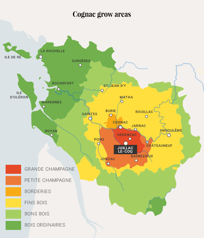 The 25 hectare vineyard of the Domaine de la Pouyade is located in Juillac-le-Coq, in the heart of the best of Grande Champagne also called “the golden triangle” (Angeac-Champagne, Verrières and Juillac le Coq). The establishment of the vines on this limestone fault and the exposure of the vineyard on the very sunny produce a wine ideal for distillation.