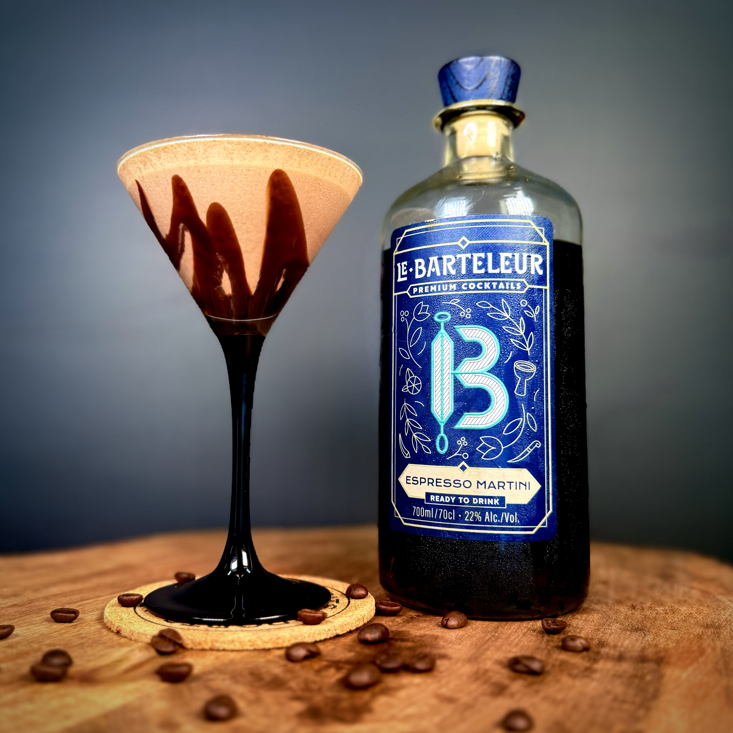 Add ice cream and Le Barteleur Espresso Martini to a blender. Drizzle a martini glass with chocolate syrup. Pour and garnish with espresso beans.